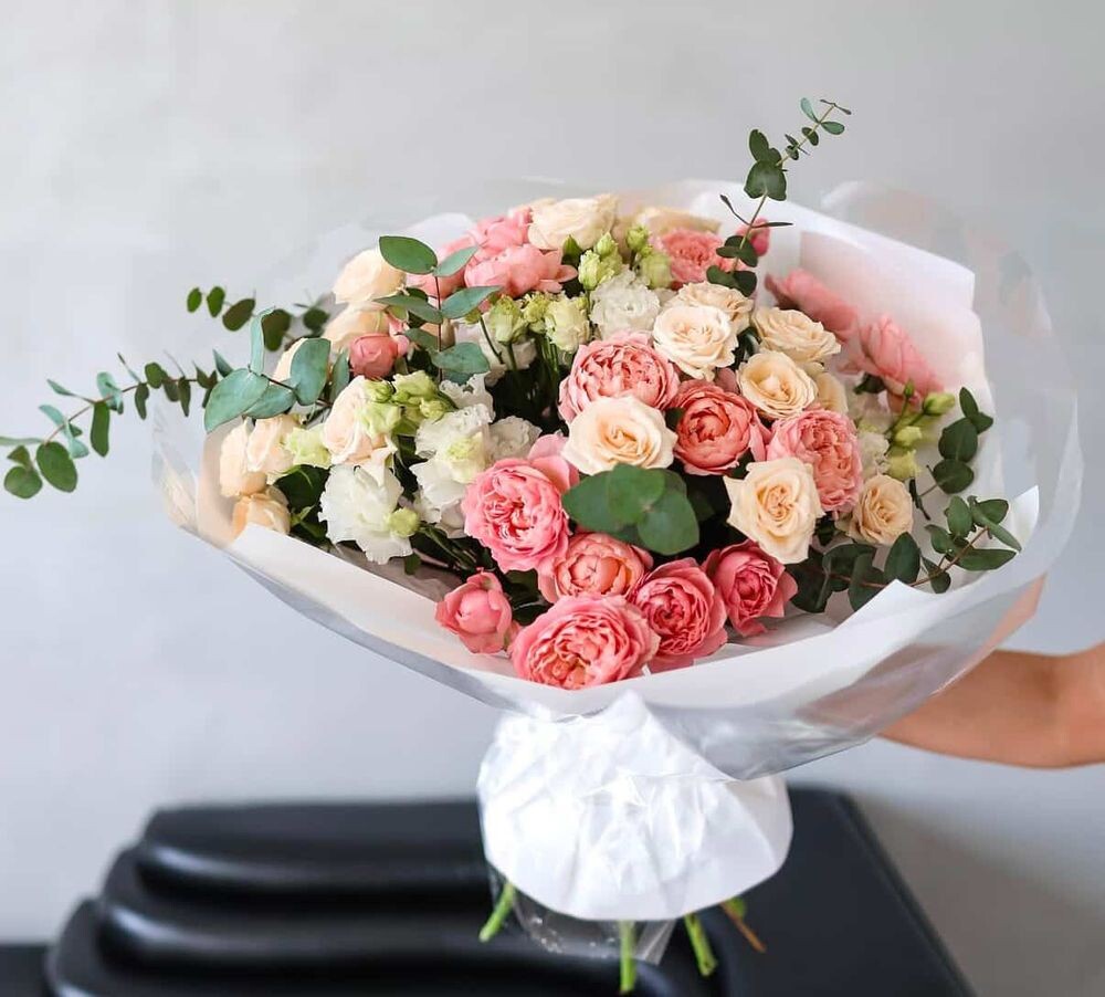 Роза кустовая пионовидная 10 шт Эустому белая 3 шт Эвкалипт 4 шт Упаковка дизайнерская Открытка