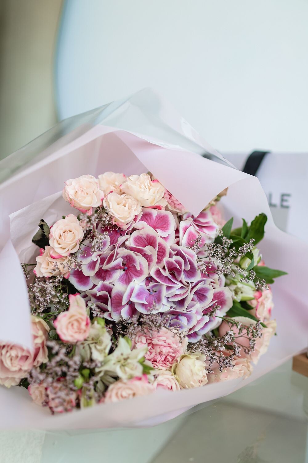Гортензия микс 1 шт Роза кустовая 3 шт Зелень 2 шт Лимониум 3 шт Упаковка дизайнерская Открытка
